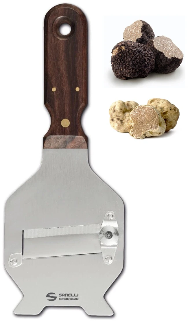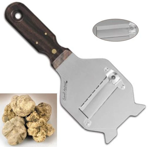 Mandolina tagliatartufi con lama liscia in acciaio inox e manico di pregiato legno di palissandro.