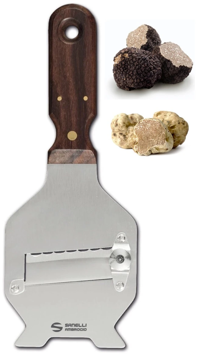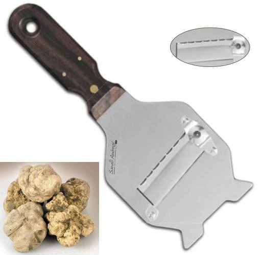 Mandolina tagliatartufi con lama a taglio ondulato in acciaio inox e manico di pregiato legno di palissandro.