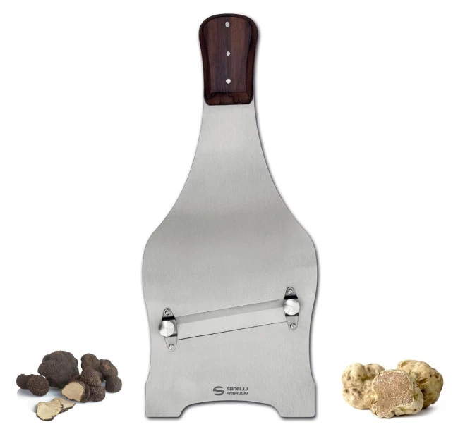 Affettatartufi gigante in acciaio inox e palissandro perfetto per affettare il vostro pregiato tartufo bianco e nero.