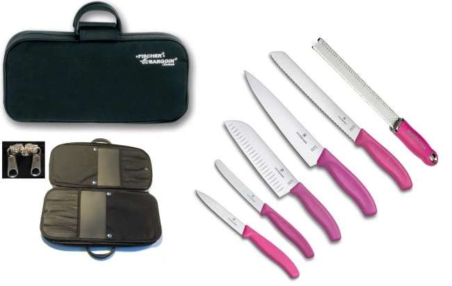 Comoda valigetta di Fischer Bargoin completa di 5 coltelli della serie Swiss Classic di Victorinox e 1 grattugia per agrumi, zenzero o formaggi stagionati di Microplane, tutto fucsia.