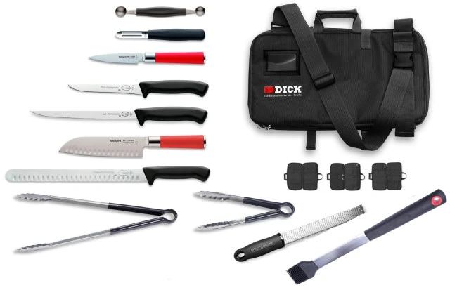 In una capiente valigetta Culinary Bag di Dick completa di 5 coltelli per la preparazione e il taglio delle carni o del pesce, 2 pinze, 1 grattugia e 1 pennello, tutto il necessario per lavorare al meglio le vostre preparazione al barbecue, per partecipare a delle competizioni o per portarvi con voi il necessario nelle vostre vacanze, dove la cottura alla griglia accompagna i vostri pranzi e le vostre cene.