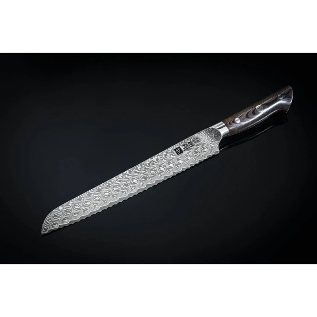 Questo Coltello giapponese Pane Seghettato Serie Takumi è stato sviluppato da Zwilling utilizzando un acciaio premium di 100 strati, in design Damasco con 1 nucleo di acciaio FC 63 e garantendo la superiore durezza e ritenzione del bordo di tutti i coltelli della serie.