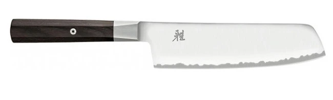 Presenta una lama in acciaio super FC61 accentuata da un logo MIYABI inciso e un comodo design con impugnatura in forma ottagonale con un elegante spilla a mosaico.