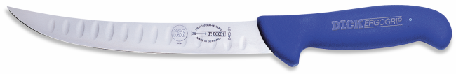 Coltello professionale con lama curva e completa di alveole per sezionare la carne.