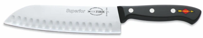 Qualità superiore di Dick per questo Santoku di cm. 18 costruito con alveole nella lame per garantire il distaccamento dell’alimento durante il taglio.