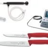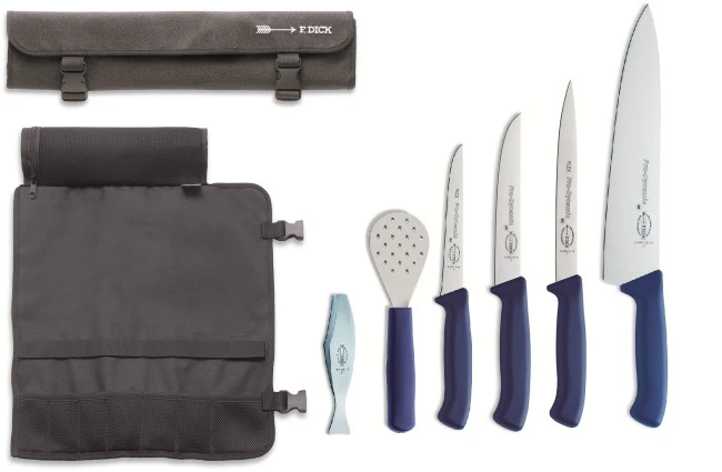 Una valigetta-avvolgibile completa di tutti i coltelli e gli accessori indispensabili per la lavorazione del pesce sia in una cucina professionali, che nel banco pesce di una pescheria. Manico blu nel rispetto della normativa HACCP.