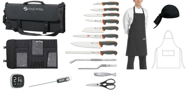 Se siete in partenza per un viaggio di lavoro o dovrete iniziare in un nuovo ristorante o in un locale con cucina, questa valigetta di Sanelli Ambrogio completa di 8 coltelli, 3 pinze, forbici, timer, termometro e accessori di abbigliamento, vi consentirà di lavorare con i vostri strumenti di cucina in piena autonomia.