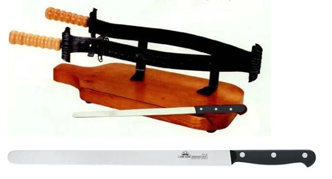 Per affettare il vostro prosciutto con il coltello, posizionandolo in morsa ed eseguendo fette perfette grazie ad un coltello con lama flessibile, tagliente.