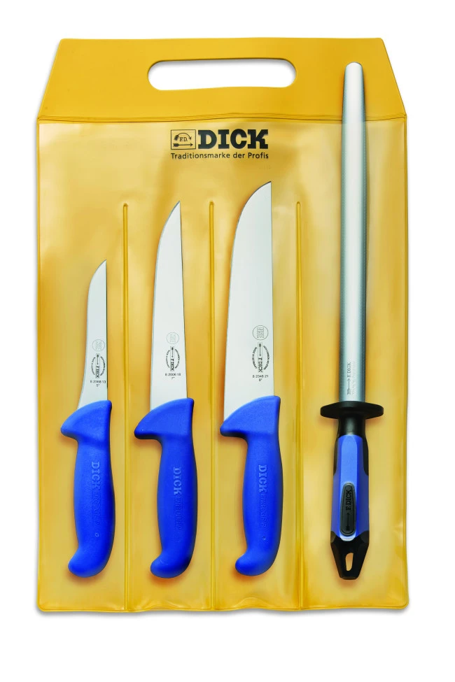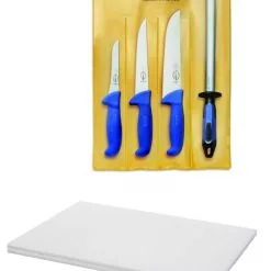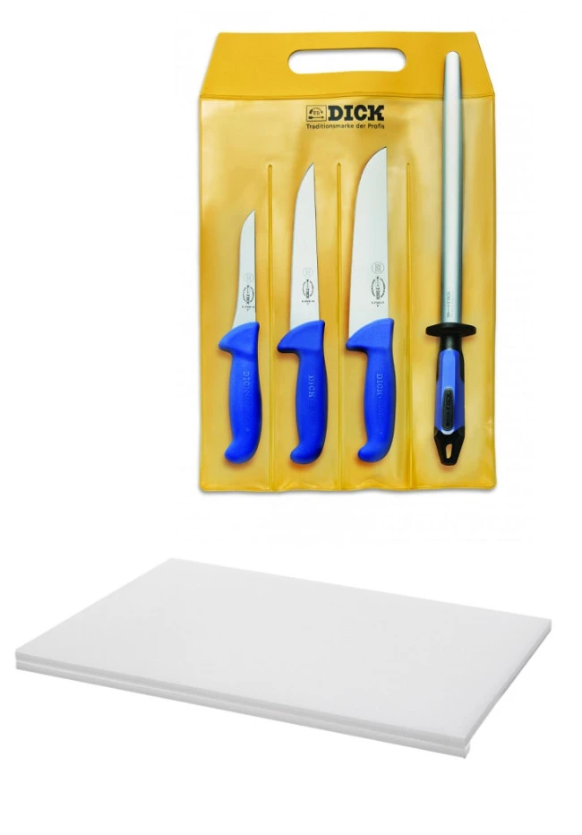 Oltre agli eccellenti coltelli tedeschi di F. Dick della serie ErgoGrip potrete trovare nel set un acciaino FineCut che vi consentirà di ravvivare il filo mentre state lavorando e un tagliere in polietilene bianco.