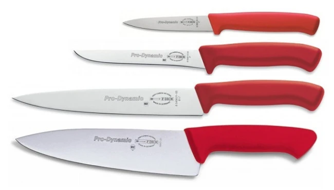 Set 4 coltelli Carne Prodynamic HACCP manico rosso di Dick ideali per la lavorazione della carne cruda.