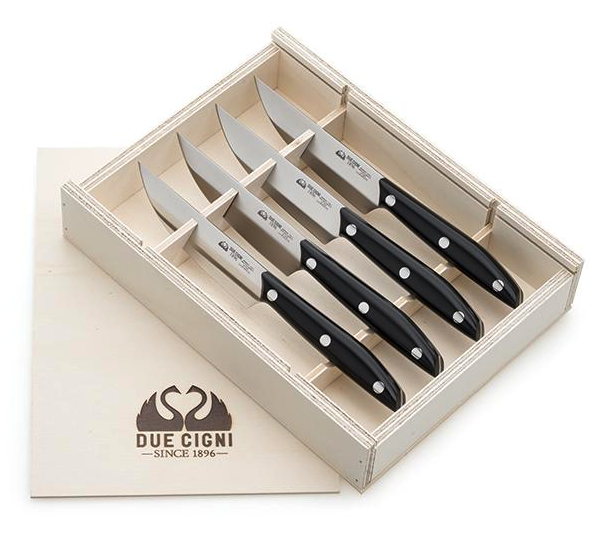 Set di 4 coltelli da bistecca con filo liscio e manico in POM della Linea 1896 di Due Cigni Coltellerie.
