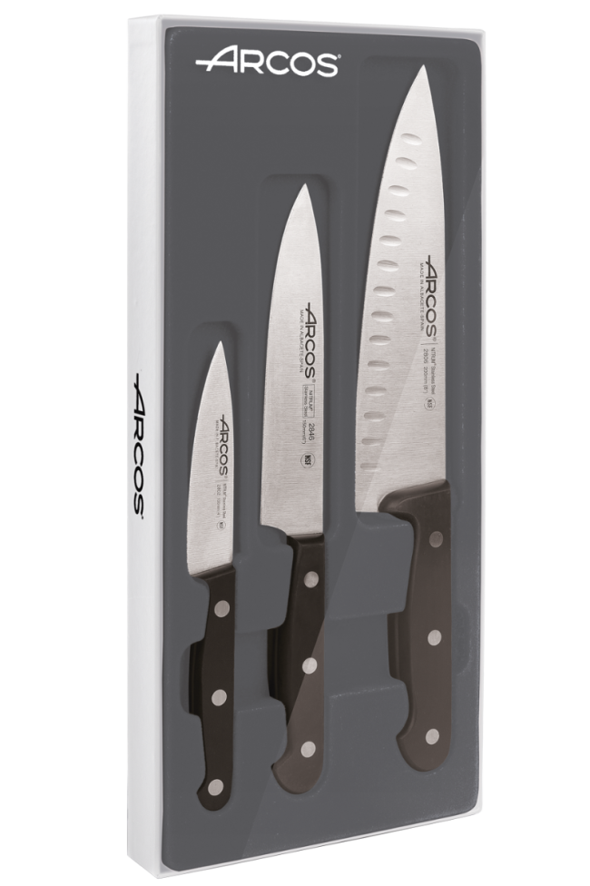Questo moderno set di 3 coltelli da cucina della serie Universal di Arcos presenta una lama in acciaio inossidabile.