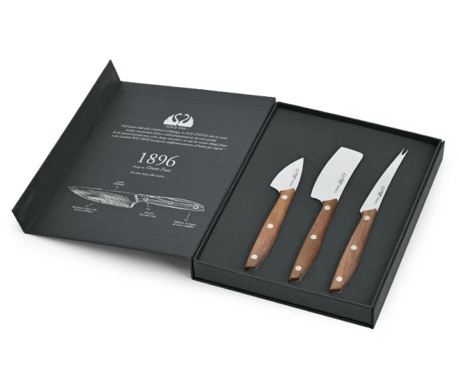 Set formaggio con manico in noce della Linea 1896 di Due Cigni Coltellerie, con tre coltelli utili per il taglio dei formaggio o per accompagnare la portata dei formaggi nella vostra tavola.