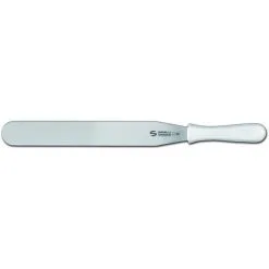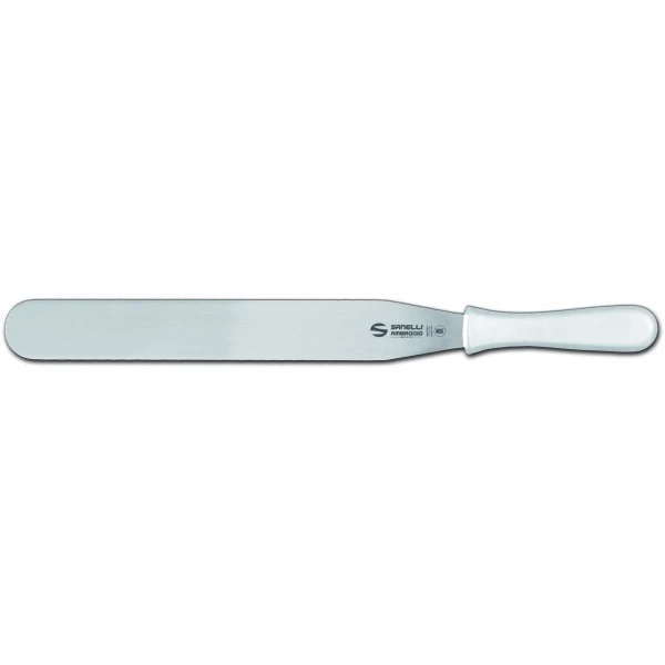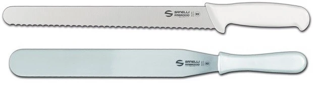 Il coltello e la spatola di Sanelli Ambrogio sono realizzati con manico bianco in elastomero TPE e gomma termoplastica, adatto all’uso in pasticceria e panetteria.