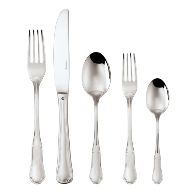 Set di posate coperto 5 pezzi monoblocco inox Petit Baroque di Sambonet Paderno di design di alta qualità, un interpretazione del Barocco piemontese tesa, se fosse possibile, alla sua maggiore perfezione formale.