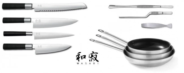 Set professionale Cucina 10 pezzi: 4 coltelli giapponesi della linea Wasabi Black di Kai con lama lucida e impugnatura nera + 3 padelle acciaio inox rivestite + 3 pinze.