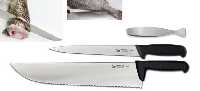 Strumenti professionali fondamentali per pulire pesce di grandi dimensioni.