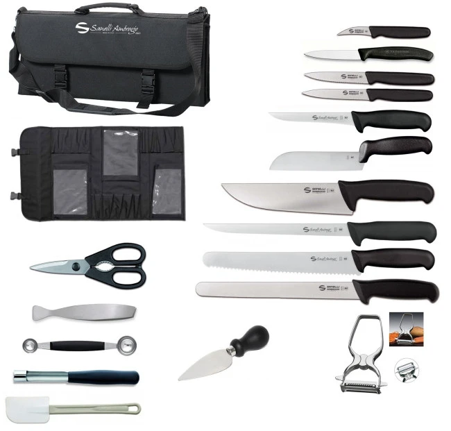 Valigetta di Ambrogio Sanelli completa di coltelli e accessori espressamente studiata per l’utilizzo professionale: elevata qualità delle lame, prodotte con i migliori acciai Bonpertuis® specifici per la coltelleria, abbina impugnature ergonomiche in elastomeri termoplastici TPS.