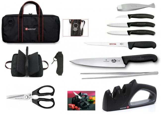 Una splendida valigetta di Wusthof completa di coltelli Serie Fibrox di Victorinox, coltelli apprezzati e amati dai professionisti di gastronomia e cucina.