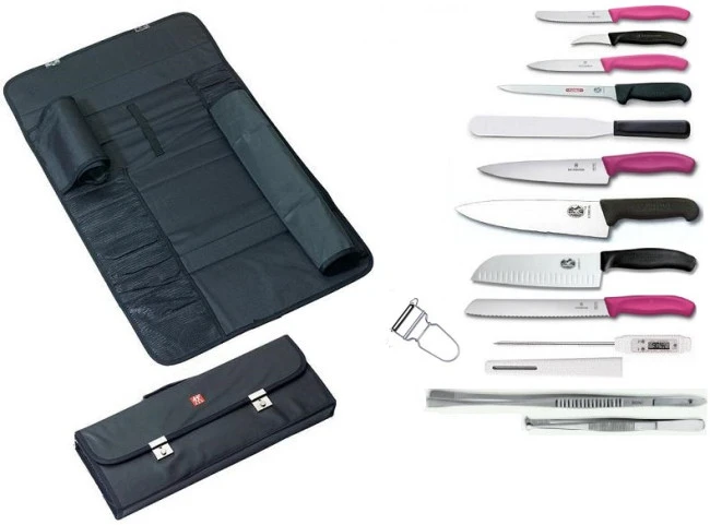 Valigetta completa di coltelli Victorinox e accessori ideale per la cuoca che desidera avere tutto in necessario per il lavoro professionale in cucina.