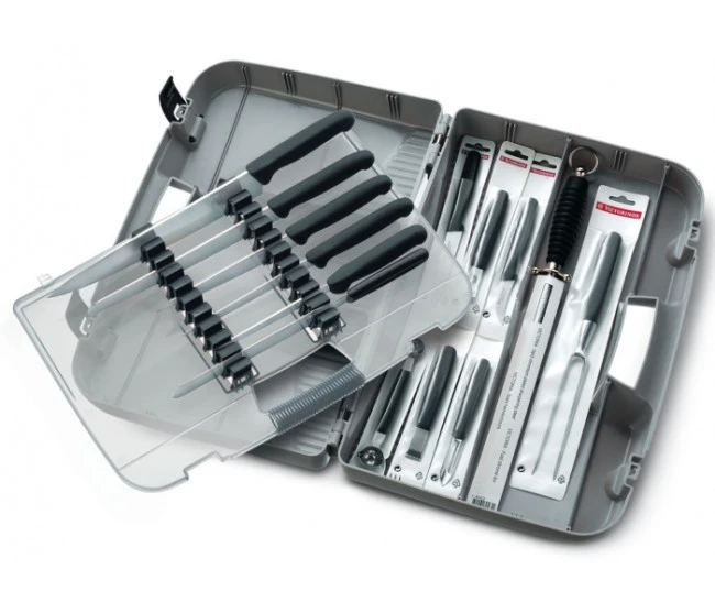Valigia in polpropilene grigio, rigida completa di divisorio portacoltelli, coltelli della linea Fibrox e accessori.