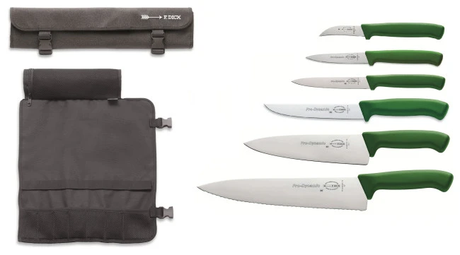 La serie Prodynamic di Dick si unisce in un’unica valigetta avvolgibile completa di coltelli con manico verde per la lavorazione delle verdure e della frutta.
